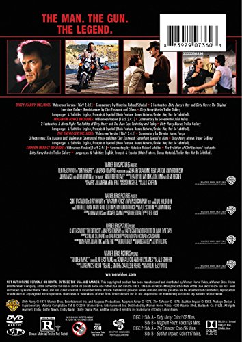 Dirty Harry, Magnum Force, The Enforcer, & Sudden Impact MAGNUM FORCE INCLUDES: • Widescreen [16×9 2.4:1] Version • Commentary by Screenwriter John Milius • 2 Featurettes: A Moral Right: The Politics of Dirty Harry and The Hero Cop: Yesterday and Today THE ENFORCER INCLUDES: • Widescreen [16×9 2.4:1] Version • Commentary by Director James Fargo • 2 Featurettes: The Business End: Violence in Cinema and Harry Callahan/Clint Eastwood: Something Special in Films SUDDEN IMPACT INCLUDES: • Widescreen [16×9 2.4:1] Version • Commentary by Historian Richard Schickel DIRTY HARRY • The Evolution of Clint Eastwood Featurette ALL 4 MOVIES INCLUDE: • Dirty Harry Movies Trailer Gallery • Languages & Subtitles: English, Français, Español, Japanese & Português (Main Feature. Bounus Material/Trailer May Not Be Subtitled). INCLUDES: • Widescreen [16×9 2.4:1] Version • Commentary by Historian Richard Schickel • 2 Featurettes: Dirty Harry’s Way and Dirty Harry: The Original • Interview Gallery: Reminiscences by Clint Eastwood and Others]]>
