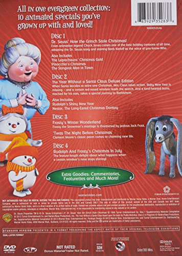 The perfect way to get the Christmas season started. 4-disc gift set includes Rankin and Bass’s most beloved Christmas specials plus When Santa decides to retire one Christmas, Mrs. Claus takes action. Baby New Year is missing – and a certain red-nosed reindeer leads the search. And a kind-hearted burro, mocked for his ears, takes a special journey to Bethlehem. Also Includes: RUDOLPH’S SHINY NEW YEAR and NESTOR THE LONG-EARED CHRISTMAS DONKEY DISC 3: FROSTY’S WINTER WONDERLAND Frosty’s The Snowman’s marriage is threatened by jealous Jack Frost. ‘TWAS THE NIGHT BEFORE CHRISTMAS Clement Moore’s classic poem comes to charming new life. the Dr. Seuss Holiday classic. DISC 4: RUDOLPH AND FROSTY’S CHRISTMAS IN JULY The feature-length delight about what happens when a certain reindeer’s nose stops shining! DISC 1: DR. SEUSS’ HOW THE GRINCH STOLE CHRISTMAS! From animation legend Chuck Jones comes one of the best holiday cartoons of all time, adapting the Dr. Seuss story and starring Boris Karloff as the voice of you-know-Who. Also Includes: THE LEPRECHAUNS’ CHRISTMAS GOLD, PINOCCHIO’S CHRISTMAS, and THE STINGIEST MAN IN TOWN DISC 2: THE YEAR WITHOUT A SANTA CLAUS DELUXE EDITION.